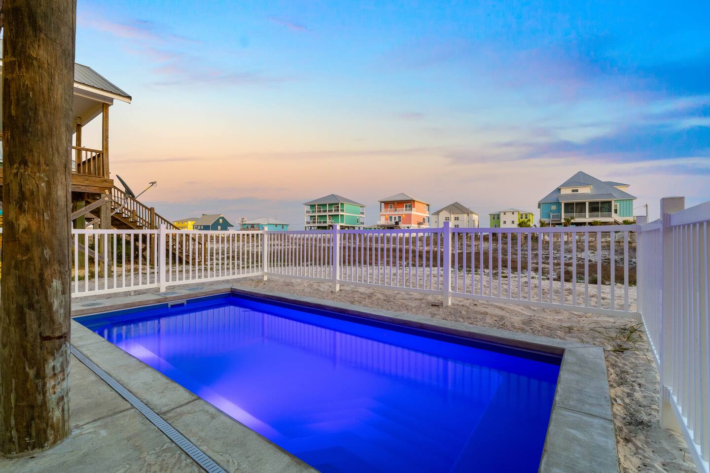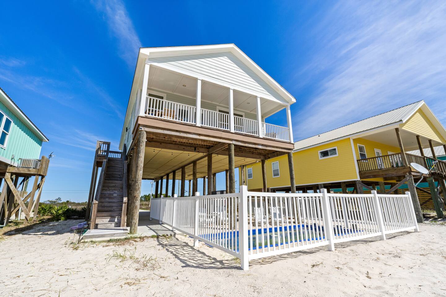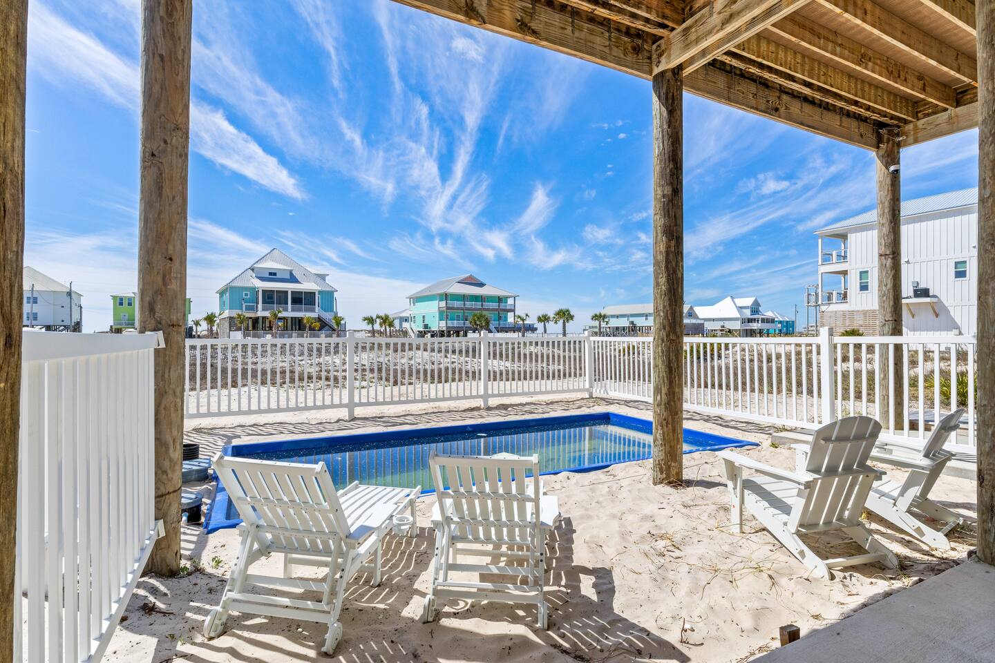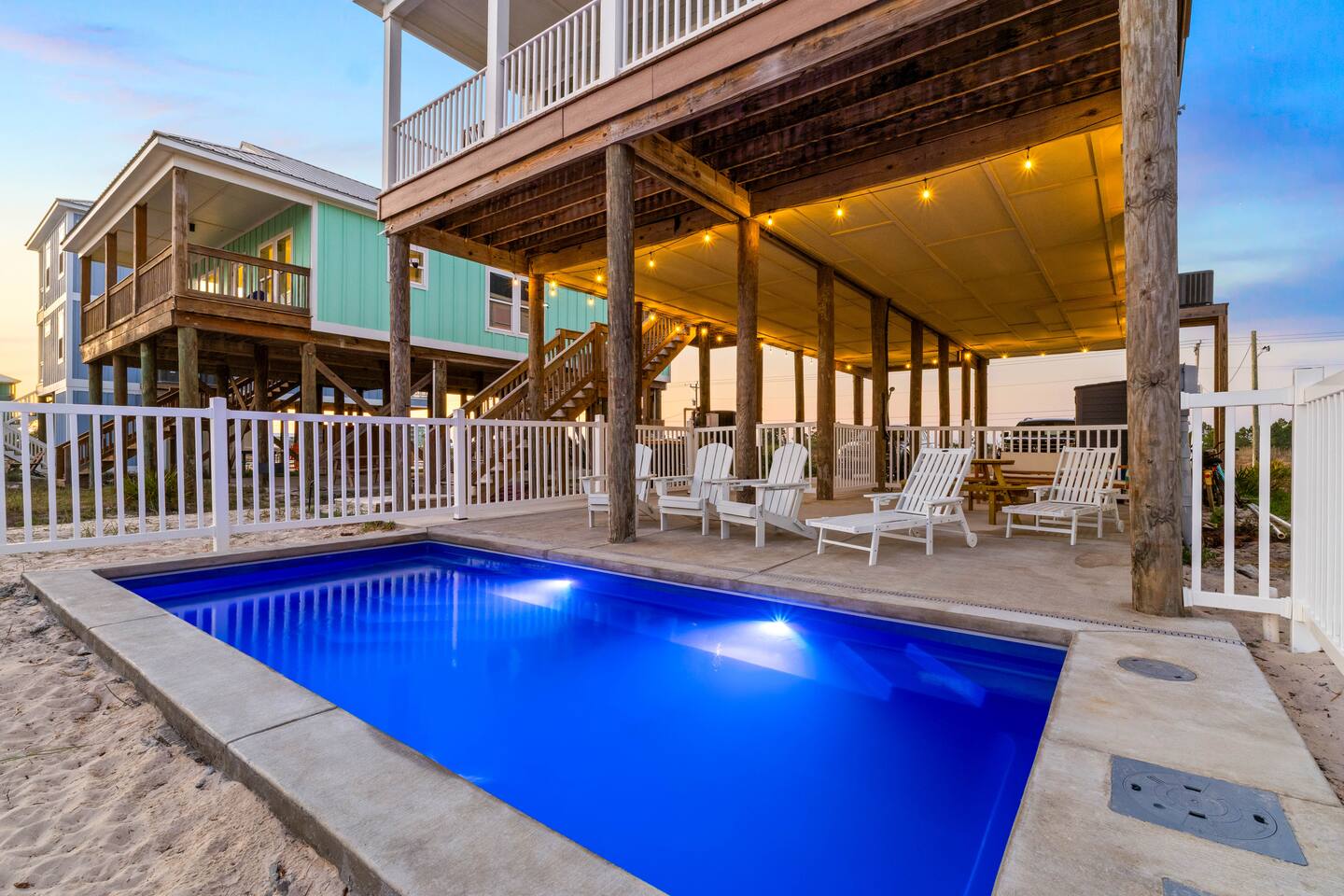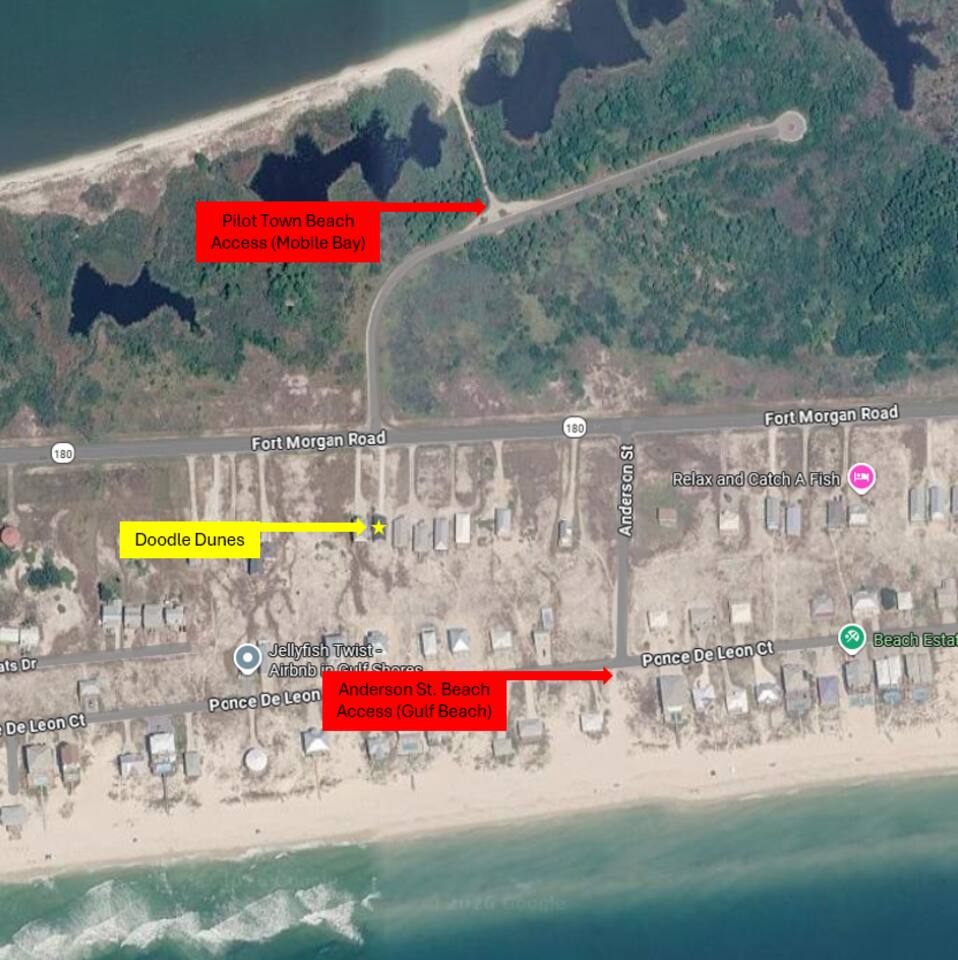 Living & Dining: Enjoy an airy, open-concept living area flooded with natural light. Relax in the cozy lounge, or step out onto the balcony to soak in the Gulf breezes and natural scenery. Chef’s Kitchen: A dream for cooking enthusiasts! Features stainless steel appliances, massive counter space, and everything you need for a fresh seafood feast. Dining: Seating for 4 at the table plus additional space for social gatherings. Bedrooms & Bathrooms: Primary Suite: Retreat to a King-size bed and your own flat-screen TV. The en-suite bathroom features a large vanity and a luxury walk-in shower with a built-in bench. Guest Suite 1: Features a Queen-size bed, TV, and a private balcony boasting peaceful views of the Bay. Guest Bedroom 2 (The Kids' Den): A fun space with a Twin-over-Full bunk bed and its own TV. Bonus Room: A versatile 4th private sleeping area with a Twin bed, Twin trundle, and a full-size washer/dryer. Guest Bathroom: Centrally located with a clean bathtub/shower combination. Outdoor Living & Beach Access: Private Pool: Splash or float in your own private heated and cooled pool—a rare find in Fort Morgan! Easy Beach Access: A flat, 5-minute walk (approx. 400 yards) takes you to the Anderson St. beach access. We provide a beach cart with balloon tires to make hauling your gear effortless. Parking: Ample covered parking under the house for 4+ vehicles. Other things to note Dog-Friendly: Fort Morgan is one of the few local beaches that allows dogs on the sand! We welcome 2 well-behaved dogs with a non-refundable pet fee. Guests will be charged for any damage caused by dogs. Dogs must remain on a leash outside. Tech: High-speed Free WiFi throughout the home. Safety & Age: You must be 25 years or older to rent. No smoking allowed.
